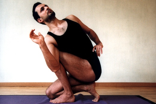 Scendete a piedi uniti, serrando le gambe, mani intrecciate sopra la testa, nella posizione di mahavajarasana mantenuto in equilibrio sui piedi