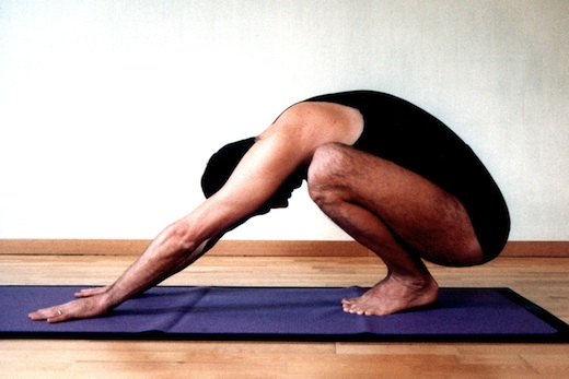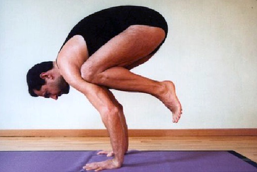 da qui agganciate con le braccia le ginocchia e salite in equilibrio sulle mani nella posizione di bakasana