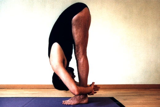 Poi portate il piede sinistro indietro riunendolo al destro, con una leggera spinta delle mani indietro salite in uttanasana, fase intermedia con ginocchia piegate e mani in presa dietro alle caviglie